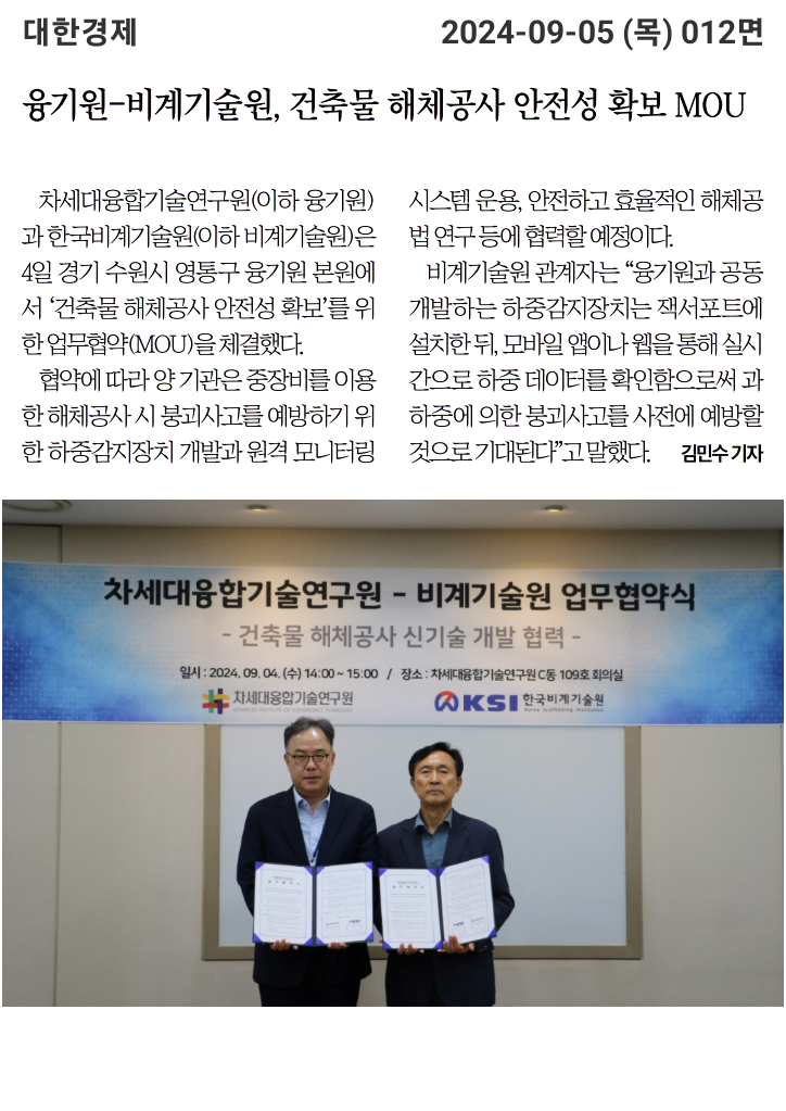 차세대융합기술연구원과 건축물 해체공사 안전성 확보 MOU
