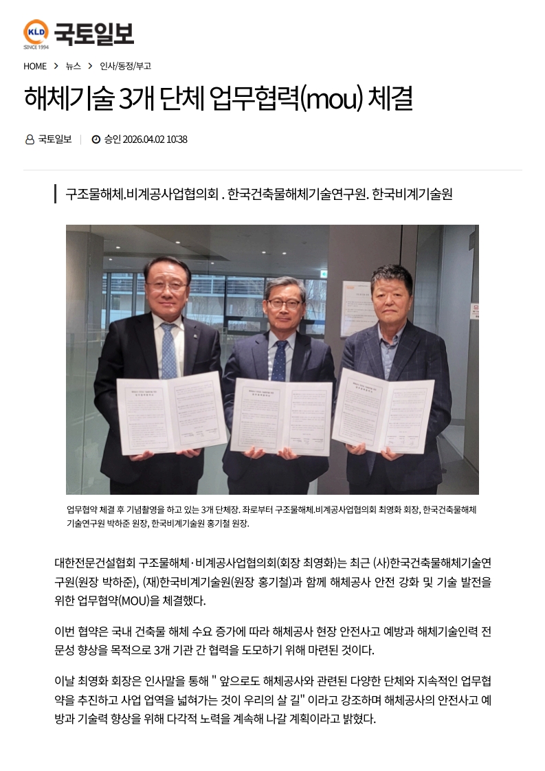 해체기술 3개 단체 업무협력(MOU) 체결