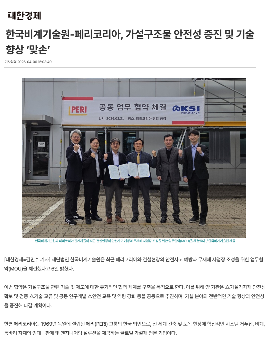 한국비계기술원-페리코리아, 가설구조물 안전성 증진 및 기술 향상 '맞손'